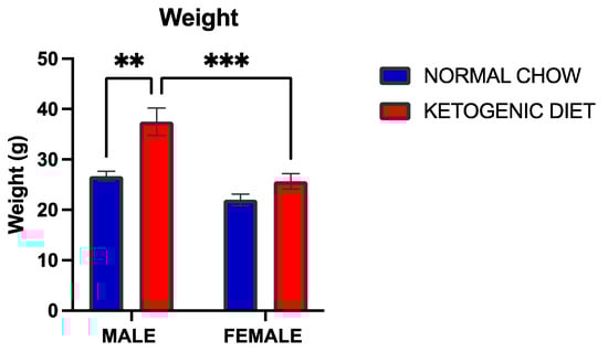 The ketogenic diet (D15010301) and the control diet (D11112201) were obtained from ResearchDiets (New Brunswick, NJ, USA) while the ketogenic diet was stored frozen, the control diet was stored at room temperature. This diet contained 89% Fats (from both animals and plants), 10% Proteins, and 1% carbohydrates; the composition of the diet is shown in Table 3. The experimental male and female mice were maintained on the ketogenic diet, while the corresponding control groups had the normal mice chow throughout the experiment. Food in the cages was replaced twice each week. The different diets were commenced in the 1st week after acclimating the animals, and mice were maintained on this diet for 12 weeks of the study. The 12-week duration of the study has proven to be very sufficient to elicit changes in the mice, even in other animal studies [,,].