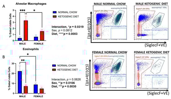 Lung eosinophils displayed sex differences in animals fed the normal chow, with males higher than females (p = 0.0106) (Figure 2B). In contrast, eosinophils were significantly decreased in the lungs of male mice fed a ketogenic diet compared to those fed with the normal mice chow (p = 0.003) (Figure 2B). While a reduction trend was also observed for female mice, the trend was not statistically significant. The interaction of sex and diet was also not significant.