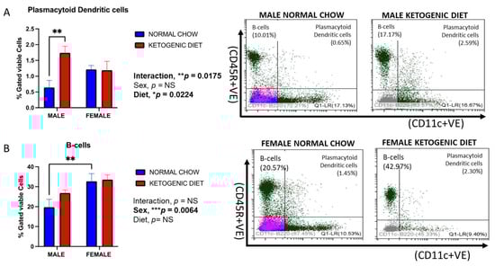 The percentage of lung B-cells was significantly higher in females than in males fed normal mice chow (p = 0.0064) but not a ketogenic diet (Figure 4B). In addition, these cells appear to be elevated in males, but not females, fed a ketogenic diet compared to those fed the normal mice chow, but the trend was not statistically significant. The effect of diet alone, or the interaction between the two factors, was not statistically significant (Figure 4B).