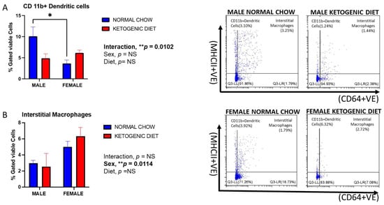 Lung CD103+ dendritic cells were reduced in male mice fed a ketogenic diet compared to those maintained on normal mice chow, although this effect was not statistically significant (Figure 5). Interestingly, this observation was reversed in females, where the percentage of cells was increased in the group fed a ketogenic diet compared to the normal chow. However, there was a marked sex difference, with females displaying higher CD103+ dendritic cells than males in the ketogenic diet group (p = 0.0091) (Figure 5). While not statistically significant, this trend was also observed for lung CD11b+ dendritic cells in mice fed the ketogenic diet (Figure 6A). In contrast, CD11b+ dendritic cells were significantly higher in males than females fed the normal chow, while no differences were observed in the ketogenic diet group (Figure 6A). The interaction of sex and diet was statistically significant for CD103+ dendritic cells (p = 0.0029) and CD11b+ dendritic cells (p = 0.012).