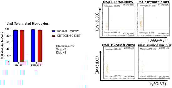 Lung interstitial alveolar macrophages were elevated in female mice fed a ketogenic or normal diet compared to males (p = 0.0114). Still, the interaction of sex and diet was not statistically significant (Figure 6B). While no statistically significant effects of diet were observed, these cells were generally higher in females fed a ketogenic diet when compared to females fed a normal mouse chow (Figure 6B). On the other hand, we observed no differences in lung undifferentiated monocytes or neutrophils in either males or females fed a normal or ketogenic diet (Figure 7 and Figure 8).