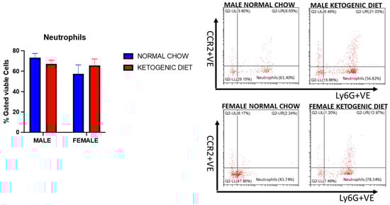 The percentages of neutrophils in the lungs of allergen-induced male and female mice fed a ketogenic diet or the normal mice chow from 3–4 weeks old for 12 weeks (n = 5–6/group). The cells were stained with antibodies and subjected to flow cytometry to determine cell-type percentages, as shown in Materials and Methods. Results shown as bar charts and flow cytometry plots depict average cell percentages (percent of live cells). Error bars denote SEM. There was no statistically significant difference at p < 0.05 in the percentage of those cells in the control and experimental groups.