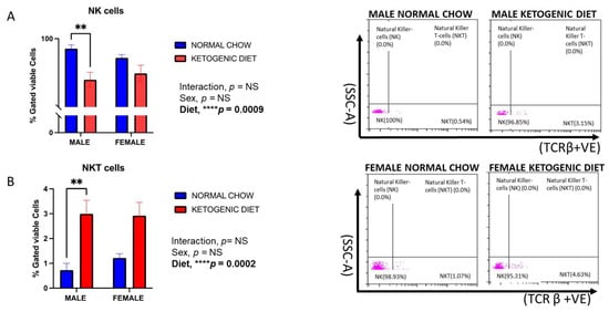 We observed a decrease in the percentage of NK cells in mice fed a ketogenic diet compared to those fed a normal chow (Figure 9A). While the interaction of sex and diet was not statistically significant, and there was no effect of sex, the diet effect was only significant in male mice (p = 0.0009) (Figure 9A). On the contrary, the lung NKT cells were elevated in male and female mice fed a ketogenic diet compared to their respective control diet groups. Still, this effect was only significant in the male group (p = 0.0002) (Figure 9B). The interaction of sex and diet was also not statistically significant for NKT cells.