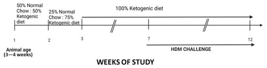 Recently, the ketogenic diet has been used as a weight loss intervention, even within a short term []. In patients with diabetes, Walton et al. reported lower body weight, blood pressure, blood lipids, and blood glucose levels after 90 days of a ketogenic diet []. Because obesity has been suggested as a risk factor for asthma and its exacerbations [], the effects of various diets on asthma patients have been studied []. While a positive association has been identified between reduction in weight and improved asthma symptoms [], it remains unclear whether the improvement of asthma symptoms observed among obese patients after a ketogenic diet administration is due to the effect of the diet or weight reduction []. Additionally, sex has not been considered a biological factor in the impact of a ketogenic diet on chronic diseases [].