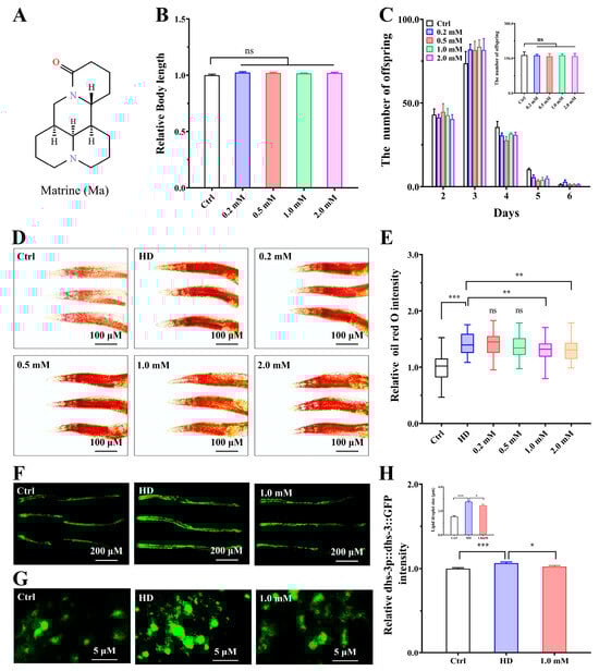 Matrine reduces fat accumulation in high-glucose-diet nematodes. (A) Molecular formula of matrine. (B) Effect of matrine on body length. Wild-type L4-stage C. elegans were incubated with matrine (0, 0.2, 0.5, 1.0, and 2.0) for 48 h and then their body lengths were measured. (C) Effect of matrine on brood size (N = 5 animals per group). Wild-type nematodes were treated as described in (B) and transferred individually to new NGM plates daily. The parents were removed after oviposition, and the offspring were counted. (D) Oil red O staining of N2 nematodes. L1-stage nematodes were fed on NGM plates with or without glucose (10 mM) and supplemented with different concentrations of matrine (0, 0.2, 0.5, 1.0, and 2.0 mM) for 72 h. (E) Quantification of fat content. (F,G) Fluorescent images of LIU1 (dhs-3p::dhs-3::GFP) nematodes. Synchronized LIU1 nematodes were incubated on normal or high-glucose NGM plates supplemented with matrine (0 and 1.0 mM) for 48 h. (H) Quantification of DHS-3::GFP fluorescent intensity and lipid droplet size in LIU1 nematodes. The results were presented as mean ± SEM (n = 50, two independent trials), ns: not significant, *: p < 0.05, **: p < 0.01, ***: p < 0.001.