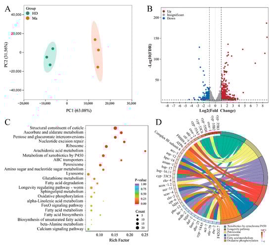 Transcriptome analysis of matrine-regulated DEGs in high-glucose-diet C. elegans. (A) Principal component analysis (PCA) of sequencing samples. Synchronized L1-stage N2 nematodes were fed with matrine (0 and 1.0 mM) for 48 h and then collected for RNA sequencing and bioinformatic analysis. (B) DEG volcano plots for high-glucose-diet nematodes treated with or without matrine. The vertical dashed lines are the threshold for DEGs. The horizontal dashed line represents the −log10(FDR) threshold. The DEGs were identified at thresholds of FC ≥ 2 and FDR < 0.05, with 706 genes being upregulated and 340 genes being downregulated. (C) KEGG enrichment of DEGs. (D) The chord diagram of DEGs. The designated DEGs regulated by matrine are clustered into 6 classifications in accordance with molecular function, including fatty acid metabolism, xenobiotic by cytochrome P450, longevity pathway, peroxisome, lysosome, and oxidative phosphorylation, and many of the DEGs contain NHR-49 binding sites (Table S1).