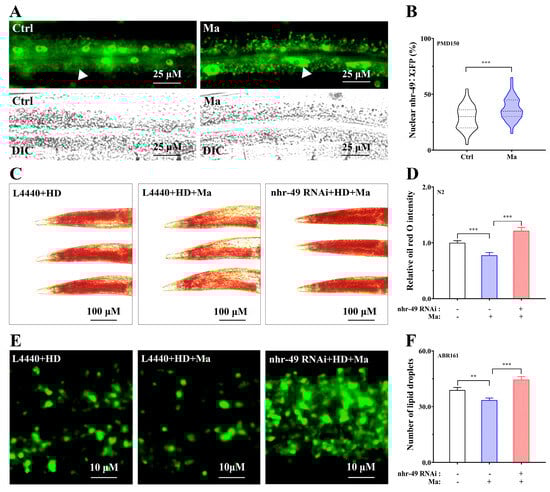 Involvement of NHR-49 in matrine-mediated fat-lowering effect. (A) NHR-49::GFP localization in PMD150 (nhr-49p::nhr-49::GFP) nematodes. L1-stage PMD150 nematodes were incubated for 24 h, and then treated with matrine (0 and 1.0 mM) for 48 h. Subsequently, the subcellular localization of NHR-49::GFP was observed. Top panel: Representative fluorescent images. Bottom panel: Differential interference contrast (DIC) images. White arrows indicate the position of intestinal nucleus. (B) Proportions of intestinal cells exhibiting nuclear-localized NHR-49::GFP. The thick dashed line is the median. The upper thin dashed line is the third quartile (Q3), and the lower thin dashed line is the first quartile (Q1). (C) Oil red O staining of high-glucose-diet N2 worms treated with or without nhr-49 RNAi. Nematodes were fed for 24 h with HT115 carrying L4440 or nhr-49 recombinant, and then placed on high-glucose plates coated with HT115 (containing L4440 or nhr-49 recombinant) and matrine (0 and 1.0 mM) for 48 h. (D) Quantification of fat content. (E) Fluorescent images of high-glucose-diet ABR161 worms treated with or without nhr-49 RNAi. ABR161 nematodes were treated with the experimental program in (C) for counting lipid droplets. (F) Quantification of lipid droplets in ABR161 nematodes. The results were shown as mean (n = 50, two independent trials). **: p < 0.01, ***: p < 0.001.