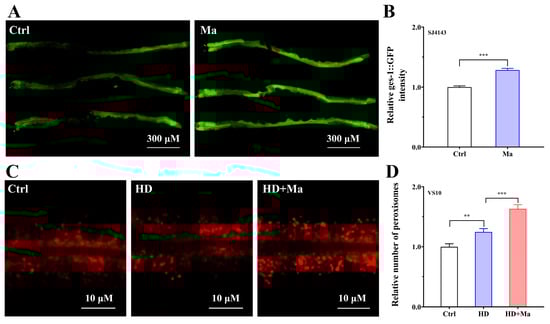 Studies reveal that AMPK is the critical regulator in modulating mitochondrial biogenesis and mitochondrial fission/fusion, in which NHR-49 may indirectly impact the structure and function of mitochondria by regulating fatty acid catabolism [27,28]. Since matrine reduced fat accumulation via the AAK-2/NHR-49 pathway, we used the transgenic SJ4143 nematodes that expressing the ges-1::GFP(mit) reporter to investigate the effect of matrine on mitochondria [29]. As presented in Figure 6A,B, matrine treatment enhanced the mitochondrial GFP intensity in intestinal cells, suggesting that activation of the AAK-2/NHR-49 pathway by matrine increases mitochondrial biogenesis and impacts mitochondrial function. In addition, peroxisomes are also closely related to lipid droplets and their capacities to carry out fatty acid decomposition and the detoxification of glyoxylate, particularly in efficiently decomposing long-chain and ultra-long-chain fatty acids [30]. Therefore, the transgenic VS10 nematodes (vha-6p::mRFP-PTS1) were used to investigate the effect of matrine on peroxisome biogenesis and function. The results showed that a high-glucose diet could significantly increase the number of peroxisomes (Figure 6C), possibly reflecting the changes in metabolic state after a high-glucose diet. However, it was worth noting that matrine treatment further increased the number of peroxisomes (Figure 6D). It is speculated that matrine promotes fatty acid β-oxidation by activating the AAK-2/NHR-49 pathway, thus causing an increase in the number of peroxisomes. Taken together, our study suggests that matrine activates the AAK-2/NHR-49 pathway, thereby affecting the biogenesis and function of mitochondria and peroxisomes.