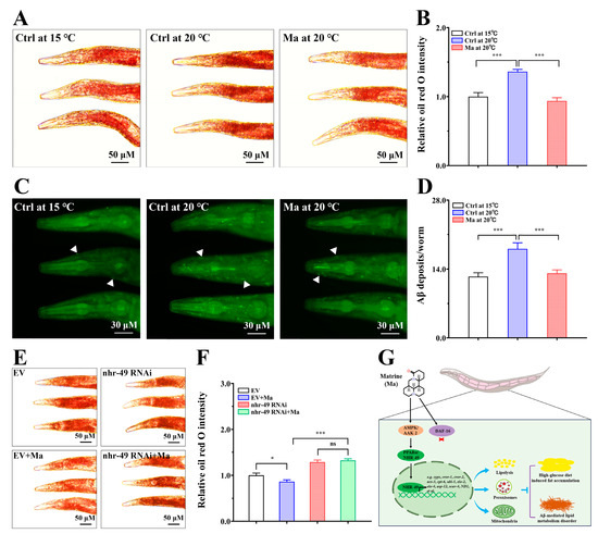 AD is an age-associated neurodegenerative disorder accompanied by gradual memory loss and behavioral abnormalities, which is characterized by Aβ plaques and Tau neurofibrillary tangles [32]. In addition to these pathological hallmarks, abnormality in lipid metabolism has been considered another pathological characteristic of AD, which is related to pathogenesis and progression [33]. For instance, a study on the metabolite profiles of the cerebrospinal fluid of patients with AD found that lipid metabolic disorder was directly bound up with neuronal degeneration and memory decline [34]. Surprisingly, we found that Aβ aggregation toxicity induced lipid metabolic disorder in the AD nematode model CL2006, which is temperature-sensitive and expresses Aβ1–42 at 20 °C in its body wall muscle cells (Figure 8A,B). Since matrine could reduce fat accumulation and promote physical fitness and longevity in high-glucose-diet C. elegans, we investigated whether matrine could inhibit Aβ-induced lipid metabolic disorder in an AD nematode model. As expected, the fat accumulation in CL2006 nematodes was significantly reduced after treatment with matrine for 2 days as compared to that in the high-glucose-diet control, a 30.9% decrease (Figure 8A,B), demonstrating the alleviation effect on lipid metabolic disorder.