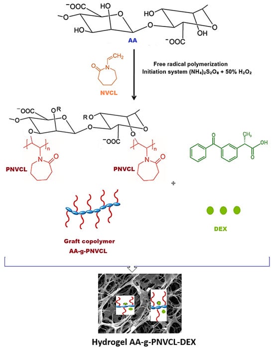 The proposed mechanism of dexketoprofen-loaded hydrogel AA-g-PNVCL-DEX synthesis.