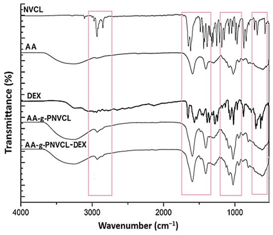 Infrared spectroscopy was used to prove the formation of polymer matrix and DEX loading. FTIR spectra of NVCL, AA, AA-g-PNVCL (HY), AA-g-PNCVL-DEX (DEXHY), and DEX are shown in Figure 2.