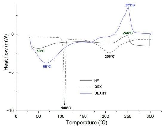 DSC thermograms of the pure drug (DEX), unloaded hydrogel (HY), and dexketoprofen-loaded hydrogel (DEXHY).