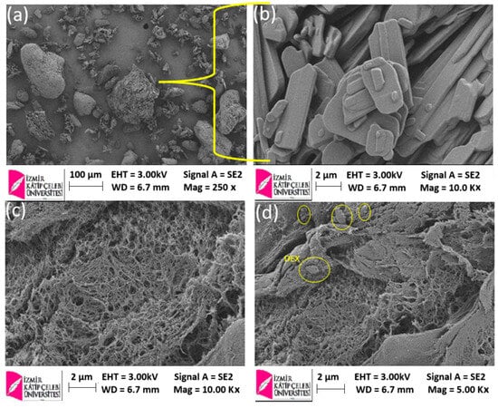 SEM images for pure dexketoprofen (DEX) at different magnifications: 250× (a); 10.00 K× (b); lyophilized hydrogel HY recorded at a magnification of 10.00 K× (c); lyophilized hydrogel DEXHY recorded at a magnification of 5.00 K× (d).