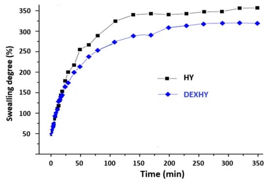 The swelling behavior of the lyophilized matrices, both with and without the drug, was analyzed in PBS at pH 7.4 and 37 °C, as shown in Figure 5. The determined maximum swelling degree was 350% for the unloaded matrix (HY) and 300% for the DEX-loaded matrix, with both matrices reaching a plateau after approximately 3 h. As shown in Figure 5, both matrices exhibited rapid swelling, reaching over 80% of their total swelling capacity within the first hour, indicating a fast swelling rate typical of a porous structure. The reduced swelling ability of the DEX-loaded matrix was consistent with the SEM images, which revealed a more compact structure with smaller pores. This suggests that dexketoprofen may be acting as a filler, being entrapped within the polymeric matrix through electrostatic interactions.