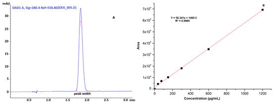 HPLC chromatogram of the loaded hydrogel DEXHY (A) and the calibration curve for drug release (B) (red colored line represents the peak width).