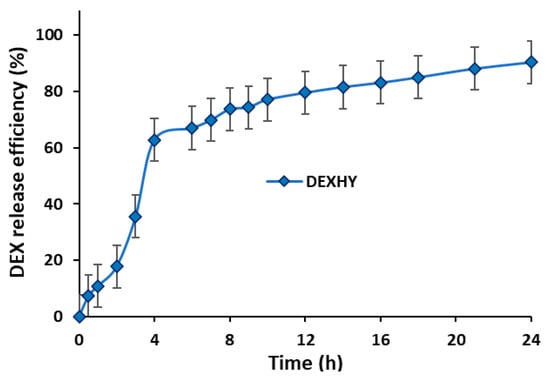 DEX release efficiency from DEXHY hydrogel. Data are mean ± SD within ±2 (n = 3).
