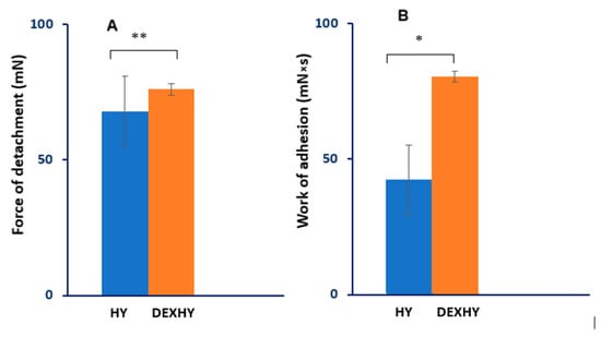 Bioadhesion properties of hydrogels HY and DEXHY, determined as the detachment force (A) and work of adhesion (B) (* p < 0.05, ** p < 0.01).