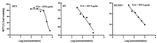 To determine the cytotoxicity and IC50 values (IC50 is the dose of the active substance required to inhibit 50% cell proliferation) of the pure active substance and the hydrogels, the MTT assay was performed. Figure 9 describes the cytotoxicity results and calculated IC50 values for all samples studied—DEXHY, HY, and DEX (IC50 values were determined by applying the sigmoidal mathematical model of the GraphPad program, (version 10). The IC50 values found for the samples we tested were 2239 µg/mL for DEX, 607.4 µg/mL for HY, and 950.4 µg/mL for DEXHY.