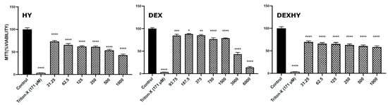 Figure 10 presents the cell viability (%) measured by the MTT assay, which reflects mitochondrial dehydrogenase activity following cell exposure to HY, DEX, and DEXHY. Each result represents the mean viability ± standard deviation (SD) of three parallel experiments (n = 3).