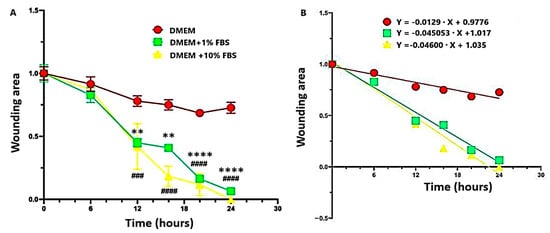 Comparison of scratch closure rates (A) and the slopes of the scratch closure rates (B) for control medium DMEM, DMEM +1% FBS, and DMEM + 10% FBS as a function of time rates (** p < 0.01, **** p < 0.0001 vs. control; ### p < 0.001 and #### p < 0.0001 vs. control).