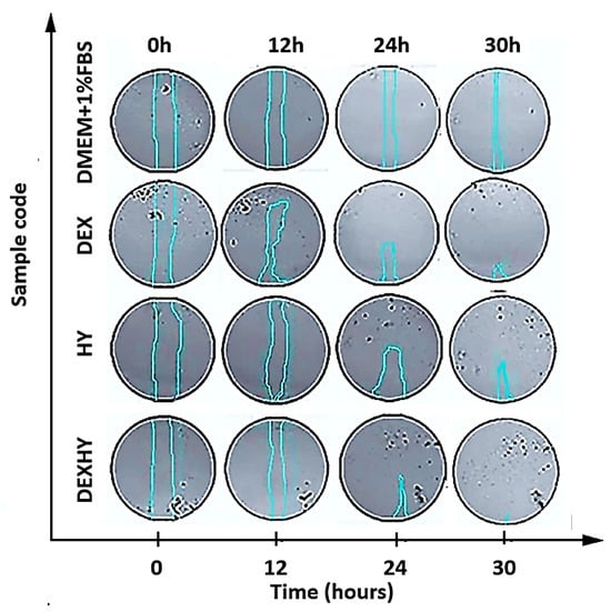 Figure 13 presented the closure of the simulated wound when the optimal medium and the tested samples were applied within the studied time interval. The closure activity was compared between the tested samples and images of scratch areas from the time points 0, 12, 24, and 30 h. It was observed that the activities of DEX and HY solutions were much higher than the DEXHY solution after 12 h; however, at 24 h and 30 h, a better activity was determined for DEX and DEXHY solutions.
