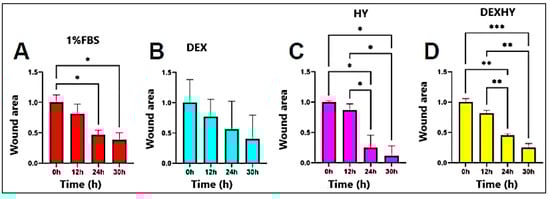 Wound areas of 3T3-L1 cells incubated with control (DMEM + 1% FBS), DEX, HY, or DEXHY until the 30th h. (A) Control, (B) DEX, (C) HY, and (D) DEXHY groups (p < 0.05 *, p < 0.01 **, p < 0.001 ***).