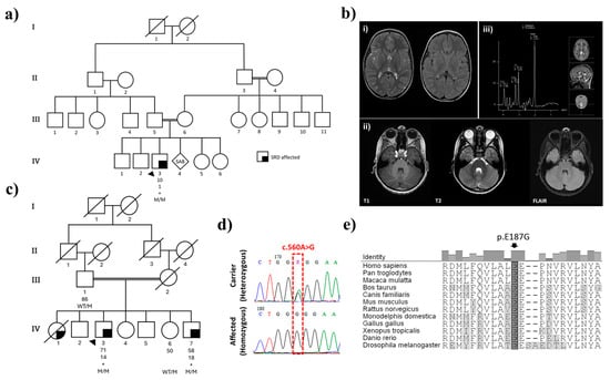 Exome sequencing for the proband (Pal_IV-3) and both brothers (Tun_IV-3 and Tun_IV-7) revealed homozygosity for SPR c.560A>G (Glu187Gly) (NCBI NM_003124.5; dbSNP rs1670577442). In both Tun_IV-3 and Tun_IV-7, optical genome mapping detected a loss of heterozygosity (LOH) in the region chr2:57,805,052–87,431,530 encompassing SPR (chr2:72,887,382–72,892,158). Subsequent Sanger sequencing of SPR exon 2 in both families confirmed homozygosity for this missense variant and segregation with disease (Figure 1d). This mutant allele exhibits extreme rarity, as evidenced by its low frequency in public databases: NCBI ALFA G = 0.00000 (0/10,680) and gnomAD V4.1.0 = 6.26 × 10−7 (1/1,597,086 alleles). Notably, genetic evaluation excluded a differential diagnosis of alternate conditions, including spinal muscular atrophy (SMA), through negative SMN1/SMN2 deletion/duplication analysis, and Pelizaeus-Merzbacher disease, as PLP1 mutation analysis was negative. In Family 2 (Tun_IV-3 and Tun_IV-7) this included exon sequencing and deletion/duplication analysis of PRKN, PINK1 and DJ-1 as genes for early-onset PD.