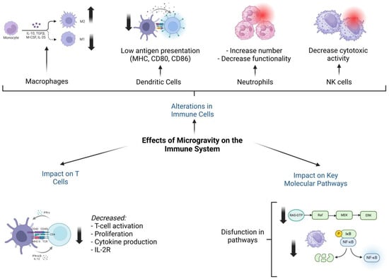 At the molecular level, microgravity disrupts critical signaling pathways, including RAS, ERK, and NF-κB. The RAS pathway, which governs cell proliferation and survival, shows reduced activity under microgravity, leading to impaired cell growth. Similarly, ERK, which is essential for cell differentiation and responses to external stimuli, undergoes alterations that hinder the activation and specialization of macrophages and lymphocytes. NF-κB, a key regulator of inflammatory responses, exhibits inconsistent activation in microgravity, resulting in inadequate immune responses [,].