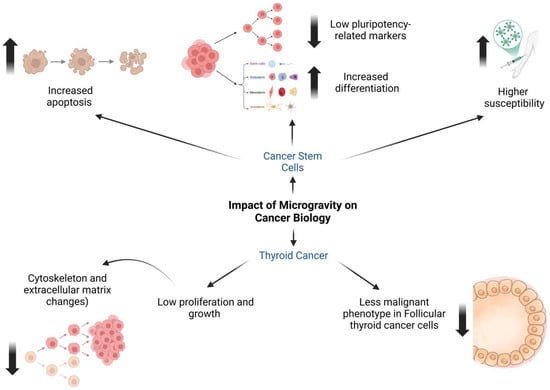 Microgravity-induced changes in cancer. This figure illustrates the diverse effects of microgravity on cancer cells, with a particular focus on cancer stem cells (CSCs) and thyroid cancer. Exposure to microgravity has been shown to increase apoptosis, or programmed cell death, in cancer cells. It also alters CSC properties, leading to a decrease in pluripotency markers and an increase in differentiation. Additionally, microgravity induces structural changes in the cytoskeleton and extracellular matrix, which may influence tumor progression. In thyroid cancer, microgravity reduces proliferation and overall growth, while also diminishing the malignant phenotype in follicular thyroid cancer cells. Interestingly, despite these inhibitory effects, microgravity appears to increase the susceptibility of cancer cells, potentially enhancing their response to treatments, as suggested by the syringe graphic. These findings highlight the complex and sometimes counterintuitive influence of microgravity on cancer biology.