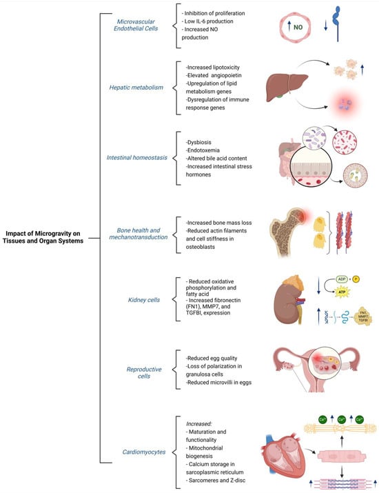 Structural and functional adaptations of tissues and organ systems in microgravity environments. This figure illustrates the broad impact of microgravity on various tissues and organ systems, highlighting key structural and functional adaptations. Microvascular endothelial cells exhibit inhibited proliferation, decreased IL-6 production, and increased nitric oxide (NO) production. In the liver, microgravity alters hepatic metabolism, leading to increased lipotoxicity, elevated angiopoietin levels, upregulation of lipid metabolism genes, and dysregulation of immune response genes. Intestinal homeostasis is also affected, with observed dysbiosis, endotoxemia, altered bile acid content, and increased levels of intestinal stress hormones. In terms of bone health and mechanotransduction, microgravity induces significant bone mass loss, accompanied by a reduction in actin filaments and decreased cell stiffness in osteoblasts. Kidney cells experience metabolic alterations, including reduced oxidative phosphorylation and fatty acid oxidation, alongside increased expression of fibronectin (FN1), MMP7, and TGFBI. Reproductive cells are also impacted, with evidence of reduced egg quality, the loss of polarization in granulosa cells, and a decrease in microvilli in eggs. Additionally, cardiomyocytes exhibit increased maturation and functionality, enhanced mitochondrial biogenesis, improved calcium storage in the sarcoplasmic reticulum, and the formation of sarcomeres and Z-disks. These findings collectively underscore the widespread and system-specific alterations induced by microgravity, significantly influencing cellular function and overall tissue homeostasis.
