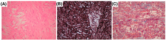 Figure 1 illustrates the histological findings in MFS patients with aortic pathology. Panel A shows a representative photomicrograph of a 28-year-old male with a giant ascending aortic aneurysm, revealing ruptured elastic fibers in the adventitia and minimal inflammatory infiltrate, stained with hematoxylin and eosin (H&E). Panel B depicts a 36-year-old female with Stanford type A aortic dissection extending into the supra-aortic trunks, highlighting the loss of elastic fiber continuity, cystic medial necrosis, vascular medial scarring, wall dissection, and focal thrombosis, stained with Weigert’s method for elastic fibers. Panel C presents findings from a 33-year-old male with DeBakey type II aortic dissection, showing extensive destruction of elastic fibers and cystic medial necrosis, stained with Masson’s trichrome.