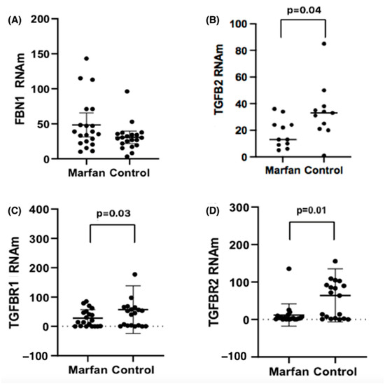 For TGFβR2 mRNA levels in patients with dilatation, we observed [Control 96.3 (0.05–282.02) vs. MFS [4 (0.40–41.3) p = 0.05]. In the case of the TGFβ2 mRNA in dissection, MFS patients had markedly lower levels of TGFβ2, with a median of 12.17 (6.54–24.70) vs. controls 44.28 (25.85–85.36), with (p = 0.02).