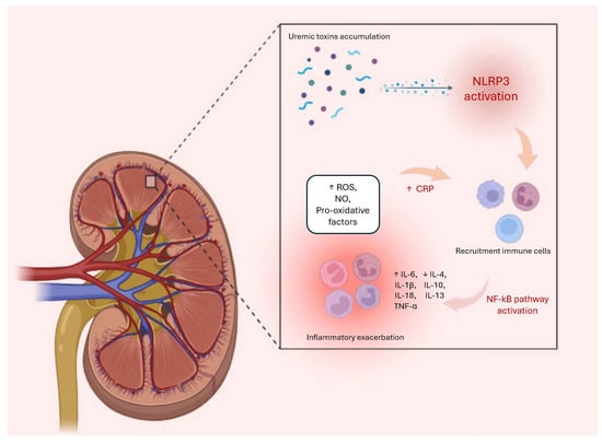During the progression of CKD, uremic toxins play a significant role in amplifying the inflammatory response by activating NLRP3, which triggers cellular stress responses. These include increases in nitric oxide (NO), reactive oxygen species (ROS), and levels of pro-inflammatory cytokines, such as IL-1, IL-1β, and TNF-α. Meanwhile, the production of pro-inflammatory cytokines and chemokines promotes the recruitment of leukocytes into the kidney. This process leads to an exacerbation of the inflammatory system, also represented by an increase in CRP levels and a decrease in anti-inflammatory cytokines, such as IL-10. The combination of these processes is responsible for the onset of various systemic complications, including fibrosis, atherosclerosis, anaemia, mineral disorders, and cardiovascular events.