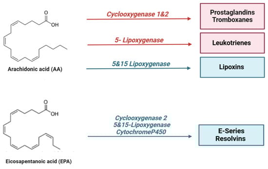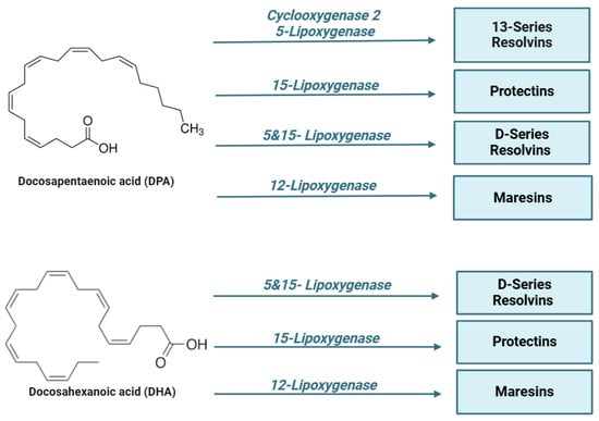 Resolvins are metabolites produced from the ω-3 polyunsaturated fatty acids, DHA, EPA, and DPA through enzymatic processes catalyzed by lipoxygenases (LOXs), cytochrome P450s (CYP450s), and cyclooxygenases (COXs) [153]. Resolvins (RVs) are categorized into two primary classes: E-series resolvins, which are derived from eicosapentaenoic acid (EPA), and D-series resolvins, derived from docosahexaenoic acid (DHA). E-series resolvins (RvE1 and RvE2) are produced by 5-lipoxygenase or COX-II in vascular endothelial cells. These resolvins can also be acetylated by aspirin to form aspirin-triggered resolvins (AT-Rv) [154,155,156].