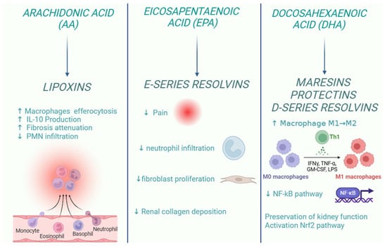 Inflammation is a central element in kidney disease, and its resolution is crucial to repristinate the physiological renal function after damage. In this context, it is important to note that SPMs play an important role in the resolution of the inflammatory response. New therapeutic strategies based on SPM aim to reduce the inflammatory response associated with kidney disease, acting on several fronts: limiting neutrophil recruitment (PMN), relieving pain, modulating fibrosis, stimulating macrophage-mediated efferocytosis, and preserving renal function through the activation of antioxidant pathways (Figure 3).
