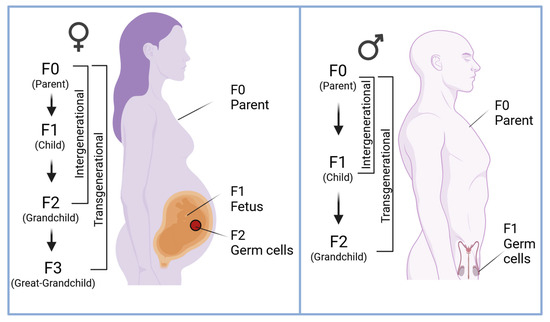 - Crews, D.; Gillette, R.; Scarpino, S.V.; Manikkam, M.; Savenkova, M.I.; Skinner, M.K. Epigenetic transgenerational inheritance of altered stress responses. Proc. Natl. Acad. Sci. USA 2012, 109, 9143–9148. [Google Scholar] [PubMed]