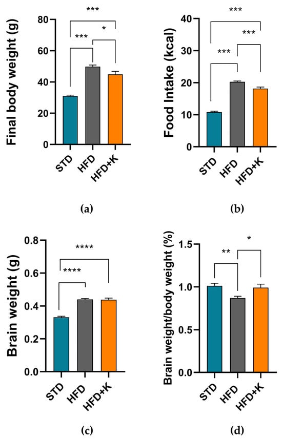 After 24 weeks on HFD, mice showed a final body weight significantly higher compared to standard diet- (STD) fed mice. Interestingly, the group supplemented with KF (HFD+K) had both a final body weight and a daily energy intake significantly lower than the HFD positive controls (Figure 1a). Remarkably, we also observed that the brain weights and the brain/body weight ratio were significantly higher in the HFD fed mice compared to STD group, suggesting HFD-induce brain atrophy (Figure 1c,d). However, in HFD+K mice the brain/body weight ratio was similar to that observed in STD mice.