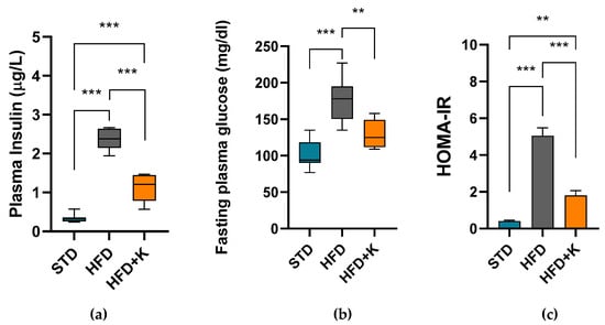 HFD obese mice also exhibited an impairment of glucose metabolism, as showed by the high plasma glucose and insulin levels and the increased Homeostatic Model Assessment for Insulin Resistance (HOMA-IR) index in comparation with STD mice. On the contrary, the HFD+K mice had plasma glucose and insulin concentration significantly lower than HFD mice and presented a clear improvement of insulin resistance as showed by the significantly reduced HOMA-IR (Figure 2).