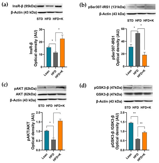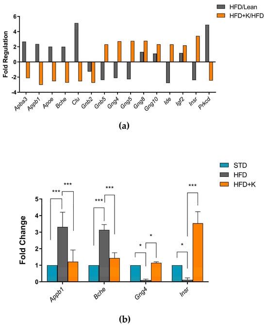To confirm the reliability of the gene expression profiling obtained from the RT2 Profiler PCR Array, we performed qRT-PCR analysis on four differentially expressed genes. Specifically, we selected Appb1, Bche, Gng4 and Insr which showed significant upregulation or downregulation in HFD+K mice compared to HFD. The qRT-PCR results were consistent with the microarray data, confirming the observed trends in gene expression changes (Figure 4). The expression levels of Gng4 and InsR were significantly increased, whereas Appb1 and Bche showed a marked reduction in HFD+K mice compared to HFD mice.