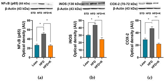 Considering the remarks in the literature highlighting the role of inflammation in the development of IR and its role in the inhibition of IRS-1 though serine phosphorylation [], we, then, investigated the involvement of pro-inflammatory events in our model. Through western blot analysis we found a remarkable overexpression of NF-κB in HFD group with respect to the STD one, hinting at a state of neuroinflammation. Remarkably, KF administration was able to counteract NF-κB overexpression bringing its levels back to control values (Figure 6a). Coherently, our results also showed how the expression of two key NF-κB downstream proteins i.e., COX-2 and iNOS were significantly increased in the HFD group and reduced to control level by KF supplementation (Figure 6b,c).