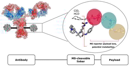 Schematic structure of an antibody–drug conjugate (ADC) and potential strategies for mass spectrometry characterization. The most common strategy is to characterize ADCs via intact protein or bottom-up LC-MS analyses, making it harder to identify antibody-conjugated payload metabolites (MS1-only strategy). An alternative strategy can be applied by taking advantage of the cleavability feature of the linker. This approach promotes the formation of payload fragments in the gas phase during mass spectrometry analysis. By triggering MS2 fragmentation, this method enables the potential identification of small molecule metabolites derived from the ADC payload.