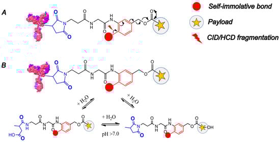 Targeted therapy is a type of cancer treatment that lays the foundation for precision medicine by targeting proteins that control how cancer cells divide, grow, and propagate. To make this feasible, a selective “carrier” must be required to transport the active molecule to the target site only on the tumor cells. Drug development companies have been improving their design of better tumor-targeted therapies using small molecules conjugated to monoclonal antibody carriers [,]. The selective delivery of pharmacologically active drugs to target tissues or cells by antibodies (Abs) makes this immuno-conjugate a promising modality for different cancer treatment [,,]. Consequently, the targeted delivery of highly potent cytotoxic drugs in antibody–drug conjugates (ADCs) has improved the selective “druggability” of several tumor antigens, resulting in minimal systemic toxicity and offering patients the benefits of cancer treatment with less severe side effects []. Currently, over 100 ADC drugs are in various stages of development worldwide. Among them, 14 have been approved for marketing, a dozen has entered clinical phase III, while the majority are still in clinical phase I and preclinical stages []. Drug conjugation can generally be achieved via reactions at lysine ε-amine side chain or cysteine sulfhydryl groups after the reduction in the interchain disulfide bonds [,,]. Recently, ADC bioconjugation has also been achieved through chemoenzymatic-based conjugation (with glycosyltransferase, transglutaminase or transpeptidase [,,]) or site-specific conjugation using non-natural amino acids [,,]. Non-cleavable linkers provide high stability in the bloodstream. They rely on the internalization of the ADC into the target cells, followed by lysosomal delivery and degradation of the ADC complex to release the active drug and kill cancer cells []. They may not release drugs into the extracellular space and cannot kill neighboring tumor cells through the bystander effect []. Furthermore, optimal linker selection depends on the chosen target antigen. Protease-cleavable linkers are also designed to be stable in plasma, but rapidly release the active drug within lysosomes in cancer cells upon cleavage by lysosomal enzymes []. They take advantage of the high levels of protease activity inside lysosomes and include a peptide sequence recognized and cleaved by these proteases. The primary goal of all linkers in ADCs is to ensure the specific release of the active drug within target cells, which is essential for controlling the toxicity of the highly potent drugs used to construct ADCs. However, the balance between efficacy and toxicity changes for the above-mentioned linkers. Moreover, the ideal linker chemistry choice ultimately depends on experimentally determining the optimal combination of the suitable linker, the ideal target antigen, and the desired payload [,]. A comprehensive understanding of the structural integrity of the linker, the payload and the conjugation site during biological exposure is crucial throughout the process of novel linker-payload design and optimization of the PK profile []. This understanding represents a key aspect in maximizing efficacy while minimizing toxicity in preclinical testing and it is essential for ensuring the successful translation to the clinical setting [,].