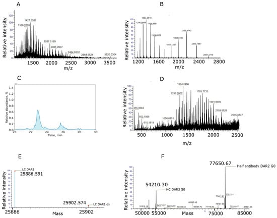 Total Ion Chromatogram for conjugated LC and HC. (A) ADC-A glycosylated Heavy chain MS spectrum at 0 h in mouse plasma. (B) ADC-A light chain MS spectrum at 0 h in mouse plasma. (C) Total Ion chromatogram of separated conjugated HC (RT = 21.8 min), LC (RT = 23.40 min) and half-antibody (RT = 25.84 min) of ADC-A at 0 h in mouse plasma in vitro stability. (D) ADC-A glycosylated half-antibody MS spectrum at 0 h in mouse plasma. (E) Deconvoluted spectrum of ADC-A light chain MS spectrum at 0 h in mouse plasma. (F) Deconvoluted spectrum of ADC-A heavy chain and half-antibody MS spectrum at 0 h in mouse plasma.