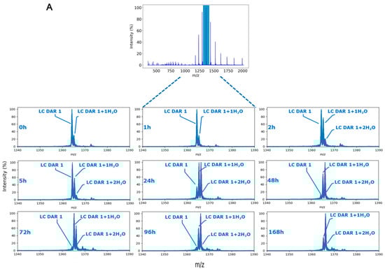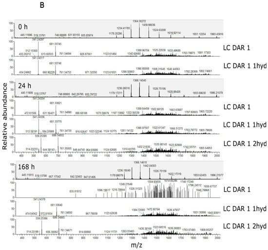 MS spectra deconvolution was performed with the BioPharmaFinder™ software 4.0 (Thermo Scientific) using the Re-Spect™ algorithm for isotopically unresolved spectra with sliding windows for heavy chain analysis. Light chain analysis was carried out using Xtract™ algorithm for isotopically resolved spectra. The DAR species were searched using the linker payload monoisotopic and average masses as variable modifications in the modification editor window of the protein sequence manager as published recently []. The input mass range was set from m/z 1400 to 5000. The output mass range was restricted to 100–160 kDa, with minimum required adjacent charge states set to 6, whereas the retention time (RT) range was restricted to the RT windows of single chains, with an RT tolerance of 1 min from the expected average RT. Mean DAR value was calculated using the equation from our previous published work []. From the total extracted ion chromatograms (XICs) of the payload fragments, the mean percentage of hydrolyzed payload was calculated (according to Equation (1)) and used to refine the mean DAR over time.