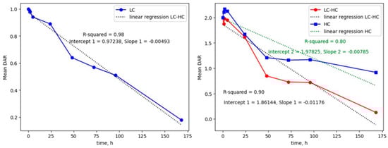 DAR decay regression analysis of ADC-A in in vitro mouse plasma stability. DAR loss over time regression analysis for LC (left) and HC and half-antibody (right) ADC species, slope represents the DAR loss unit/h in the time frame of in vitro mouse plasma stability at 37 °C and 5% CO2.