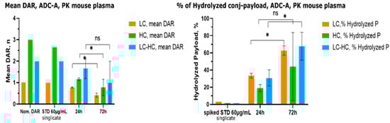 In this case, one-shot FS-AIF analysis was performed due to micro-sampling sample collection which limited the sample volume at disposition for the study. Then, in the MS2 spectrum, the total amount (%) of hydrolyzed payload coming from all different hydrolyzed species extracted ion chromatograms (XICs) in the correspondence to the chromatographic retention time (RT) of LC, HC and half-antibody was retrieved from the MS1 spectra survey scan. As can be seen from Figure 7, there is a good agreement between in vitro/in vivo hydrolysis rate for LC and half-antibody conjugated species. In fact, at 24 h ~35% of payload hydrolysis for LC and ~50% of payload hydrolysis for half-antibody in mouse plasma were reported both in vitro and in vivo. For the 72 h timepoint, a good agreement between in vitro stability and in vivo PK mouse plasma samples was also observed (~60% of payload hydrolysis rate for LC and ~70% of payload hydrolysis for half-antibody). Then, similar hydrolysis rates were found between the LC and half-antibody chains at the investigated PK timepoints. Therefore, the hydrolysis of the payload is mainly driven by pH and solvent accessibility, and there are no other in vivo-associated factors. Finally, no other modifications of the antibody-conjugated payload or covalent adducts with plasma proteins were observed.