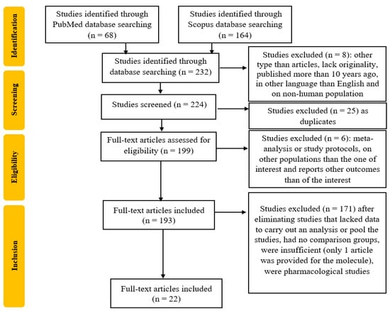 The study selection process is detailed in Figure 1. From the 232 studies initially selected, 8 were excluded due to lack of originality, having a publication date more than 10 years ago, being conducted on non-human study populations, or being written in a language other than English. Next, 25 duplicate studies and 6 meta-analyses, study protocols, or reports on unrelated outcomes were removed. From the remaining 193 studies, 171 were excluded due to insufficient data or being pharmacological studies.