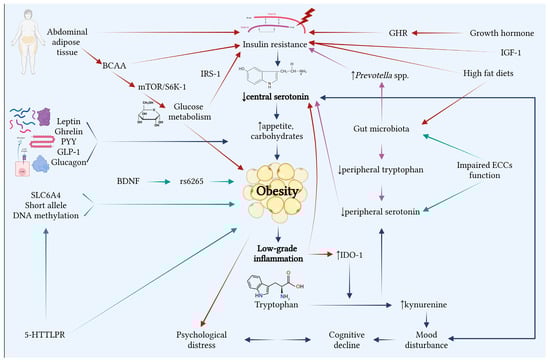 The primary mechanism involved is chronic inflammation, which is induced by obesity itself but also driven by psychological distress [], diet type [], gut microbiota composition [], and alterations in the brain network activity [].
