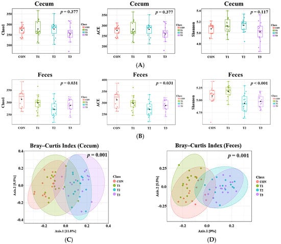 4.5. Cecal and Fecal Content Microbial Sequencing and Data Analysis