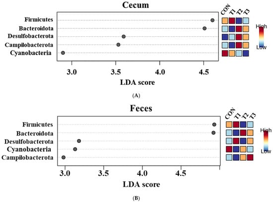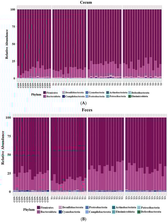 2.5. Cecal and Fecal Microbiota at the Phylum Level